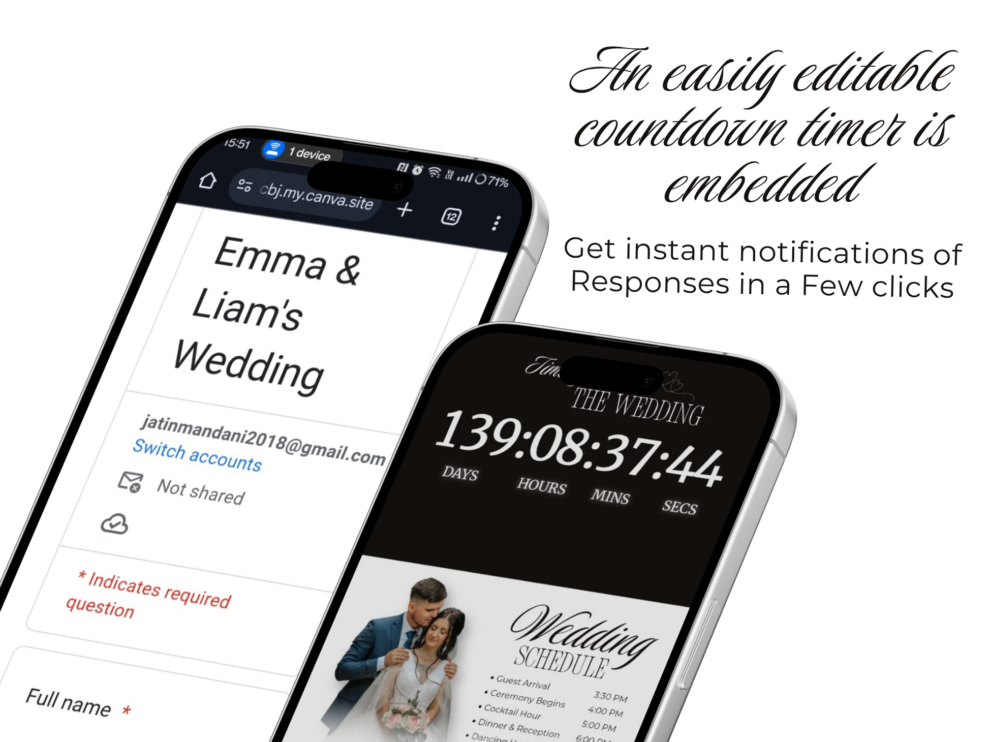 ⏳ Embedded Countdown Timer – Build excitement with a real-time countdown to your big day.