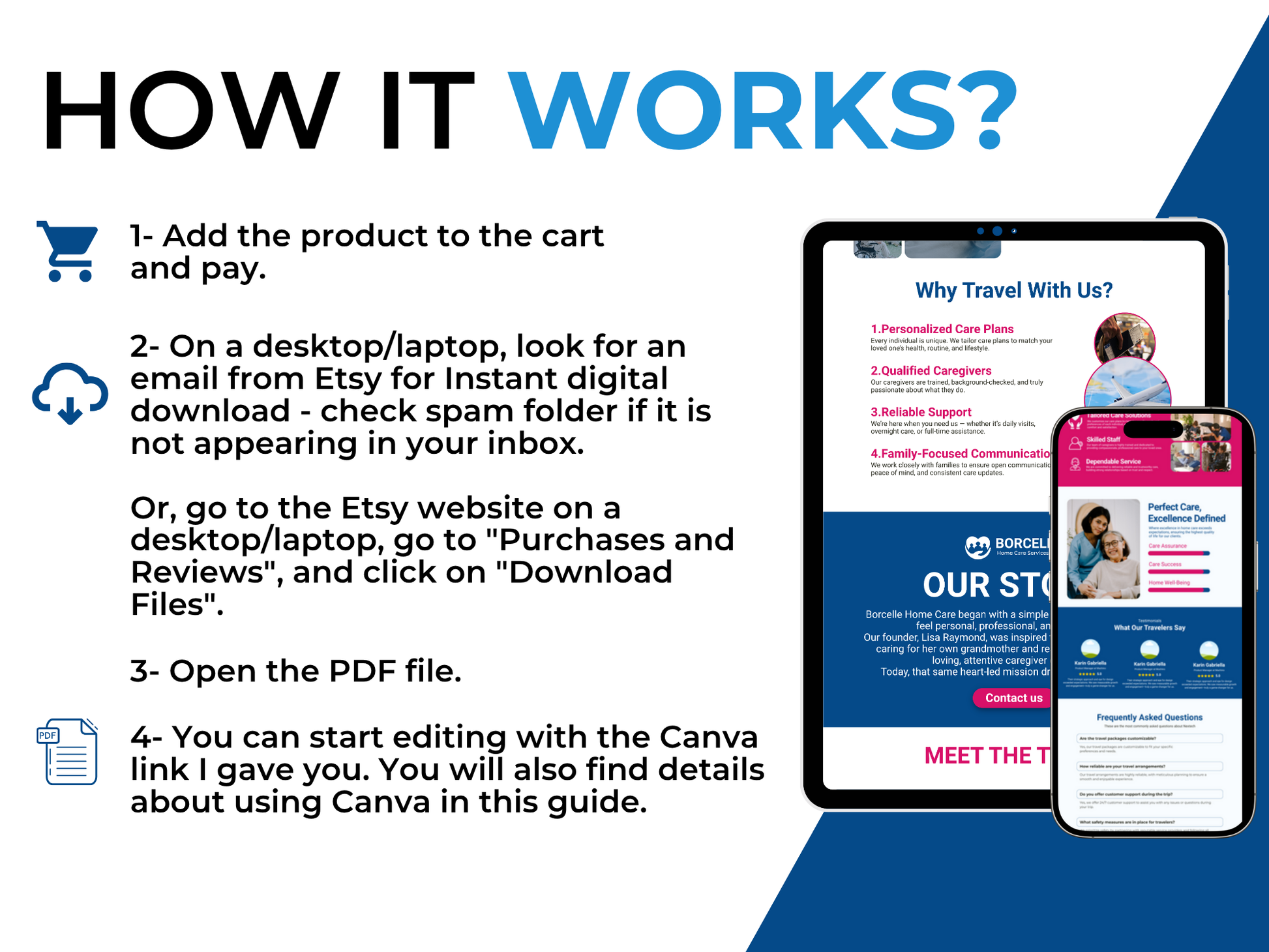 ✔ Requirements: A Free or Paid Canva account is needed to access the website template.