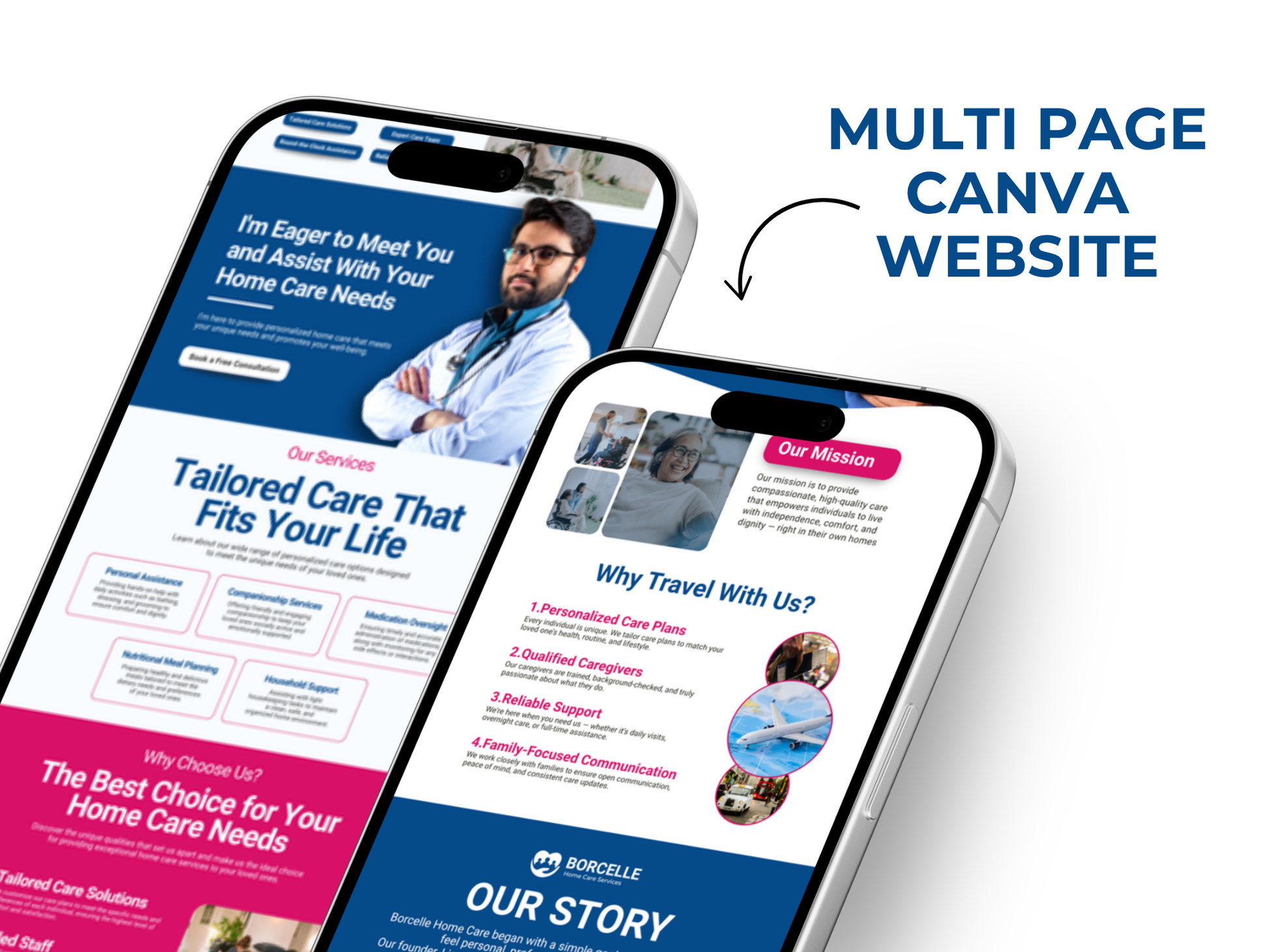 Create a warm and professional online presence with this Home Care Canva Website Template, perfect for businesses in health, wellness, and personal care services. Whether you offer home nursing, elderly care, or wellness support, this landing page template helps you showcase your services, share client testimonials, and attract new clients — all with ease.