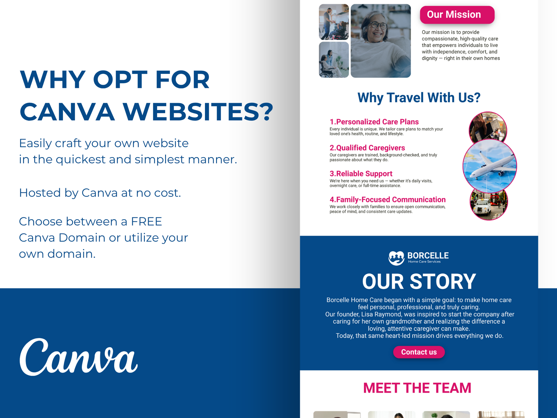 To remove Canva branding, connect your custom domain (e.g., www.yourclinic.com), and unlock advanced features, consider upgrading to Canva Pro.