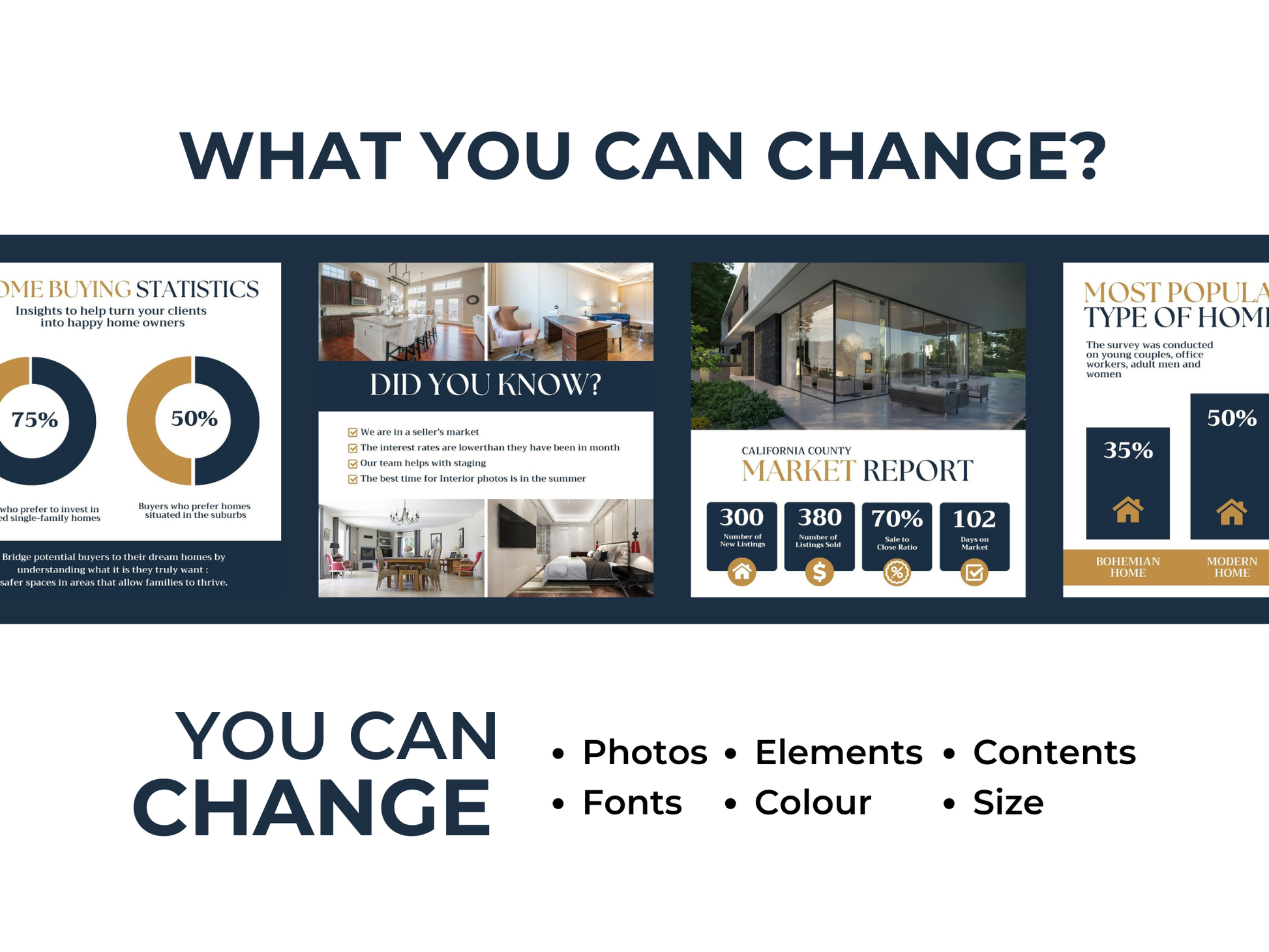One of the key benefits is that our templates are 100% customizable within Canva. Canva is 100% free and you can open all of the templates on your computer or mobile phone and customize the templates until your heart is content. While you can also alter/add text and even implement your brand colors and logo.